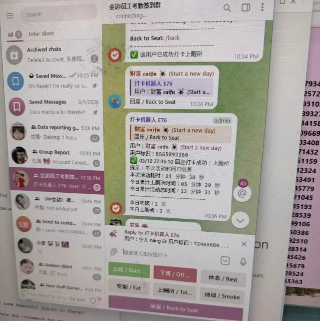 警方行动的时候,里面的人应该没来得及跑,电脑都还开着。在电脑上,我发现了一个中文打卡系统,群名叫“今天员工签到群”,里面有专门的打卡机器人。上班下班、休息吃饭、上厕所抽烟、离开座位再回座,都要打卡报备。太牛马了。