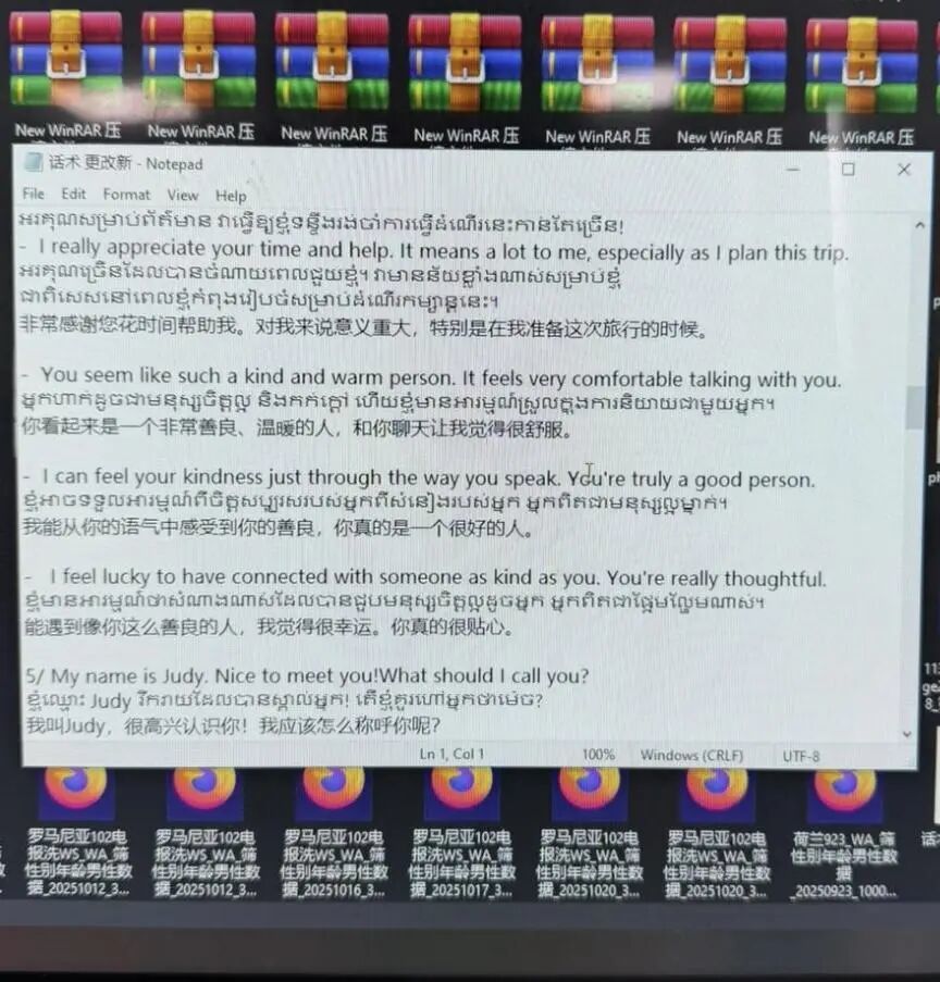电脑里,一个个压缩包分门别类,针对不同国籍、性别、年龄的潜在受害者资料;详细到分场景的英文、中文等语言的诈骗话术;用来包装人设的生活照片、色情图片。培训话术全是写好的,一句话能写出六七个不同版本,新人照着念就行,连情绪起伏都标好了。