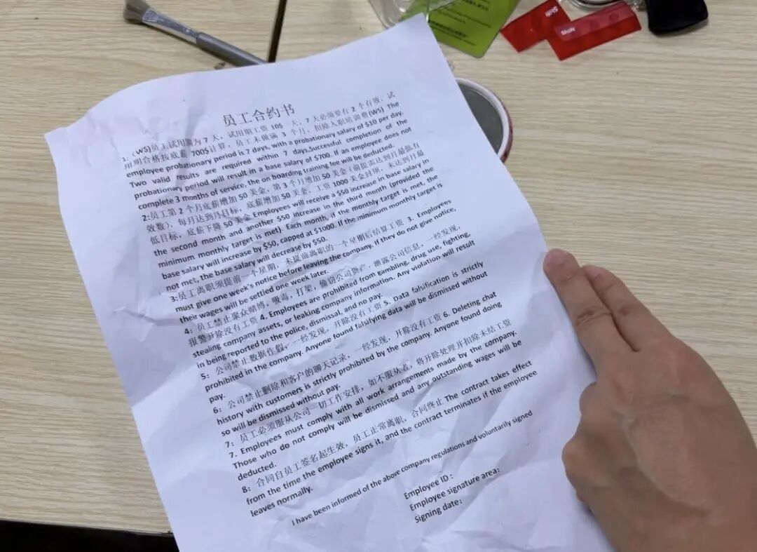 在散乱的工位上,我翻到一份“员工合约”。上面写着:新人七天试用期内必须完成至少两个“有效成果”,之后月薪700美元起。如果没做够三个月,要扣除入职培训费。严禁泄露内部信息,不能删除任何聊天记录,一旦违规直接开除并报警。合约没写什么叫“有效成果”,也没写达不到会怎样。但有一条很清楚:泄露公司信息,一经发现,报警开除。